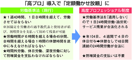 最大の焦点は、「高度プロフェッショナル(高プロ)制度」の導入です。年収一〇七五万円以上の高度な専門職(アナリスト、研究職など)の労働時間規制を撤廃し、残業代も不要、という仕組みです。休日は、年一〇四日、四週に四日とらせる、というのがルールですが、月はじめに四日休ませれば残りは連続で二四時間働かせてもOK。まさに「定額で働かせ放題」です(下表参照)。