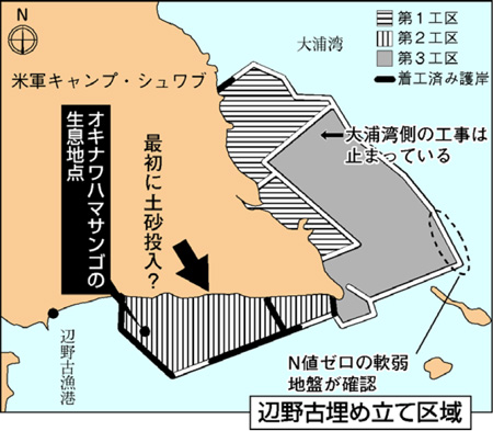 しかし、当初の日米政府の計画と比べ、工事はすでに三年遅れています。現在、埋め立て予定海域を囲む護岸工事が強行されていますが、あの護岸も海面から一〇メートルの高さを必要とする計画に対し、実際には三メートルの基礎部分しかできていません。県民と全国の人たちの決してあきらめない運動が工事を遅らせています。