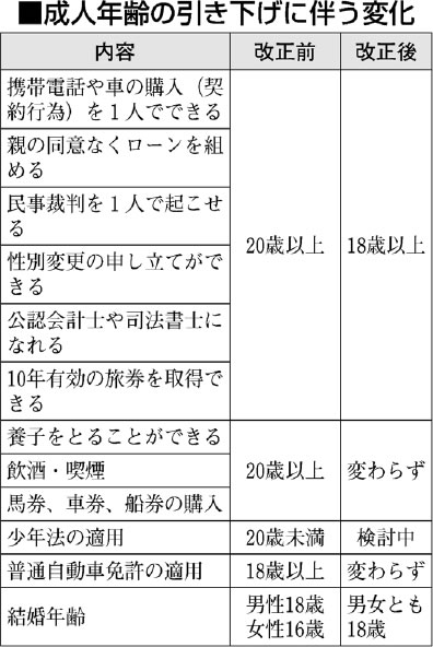 今年の通常国会で、民法の成人年齢を二〇歳から一八歳に引き下げる法案が成立しました。二〇二二年四月一日から施行されます(表参照)。
