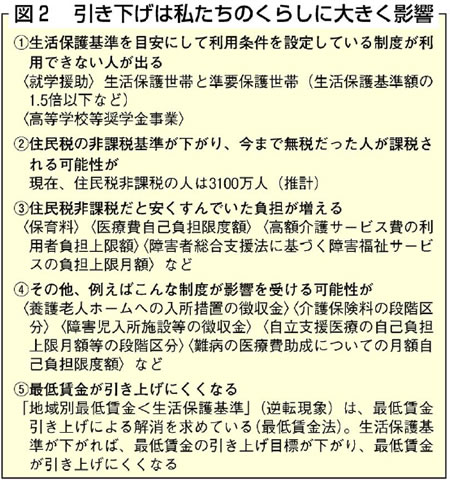 二一世紀に入り生活保護基準は引き下げ続きです。二〇〇四年から老齢加算、〇五年から母子加算を削減・廃止。母子加算は民主党政権下の〇九年に復活しましたが、再び廃止の標的とされようとしています。一三年八月から三年間かけて、生活扶助基準は平均六・五%、最大一〇%、六七〇億円も削減されました。一五年からは住宅扶助と冬期加算も引き下げ。五年ごとの生活扶助基準見直しの年に当たる今年一〇月から、三年間でさらに平均一・八%、最大五%、年額一六〇億円もの引き下げを決めています(図1)。