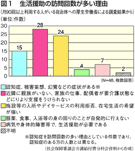 「必要以上に生活援助を利用している」という懸念が当たらないことは、厚労省が公表した調査からも明らかになりました。生活援助を月九〇回以上利用している事例を自治体が調査したところ、九六%のケースで「適切またはやむを得ないサービス利用」と判断されたのです。この調査では、利用者の八割は認知症で七割が独居。買い物や三食の調理と配下膳、服薬確認、掃除、洗濯などの生活援助を通して利用者の生活をささえていました(図1)。