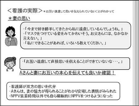 確認すると、Aさんの妻は「私にできることがあれば、いろいろ教えてください」と協力的なことがわかりました。Aさんは、妻の協力が得られることがわかり安堵(あんど)した表情をみせ、NPPV装着時間以外でも自ら積極的にNPPNVをつけるようになりました。