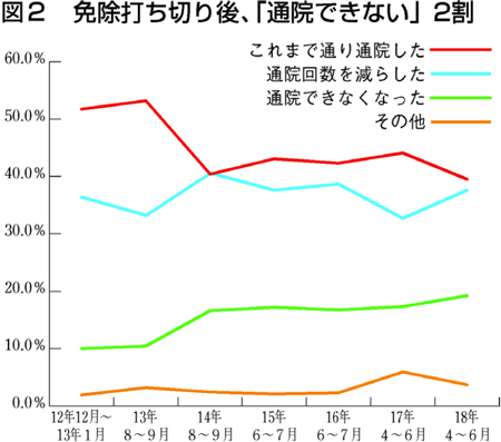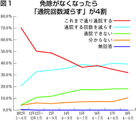 現在、免除となっている人に聞いた「負担が発生した場合、どのようにされますか」では、「これまで通り通院する」は32%。「通院回数を減らす」(39・3%)、「通院できない」(18・2%)となり、免除がなくなれば通院は困難、との不安を抱えています(図1)。