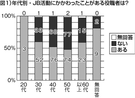 JBの目的を「知らない」は、35歳以下で3人に2人、役職者は3人に1人。役職者も半数がJB活動にかかわったことがありません(図1)。その理由1位は、35歳以下、役職者ともに「興味がない」。「わからない」「無回答」も多くありました。