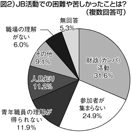 実行委員の8割が声かけから活動に参加しており、自ら参加は4・8%。8割が「負担を感じる」、4割が「楽しくない」と回答しました。活動で嫌なことは「財政活動」「参加者が集まらない」でした(図2)。参加したJB活動は7割が「よかった」と評価する一方、今後「活動へ参加したい」職員は2・1%、「実行委員になりたい」は、0・4%でした。