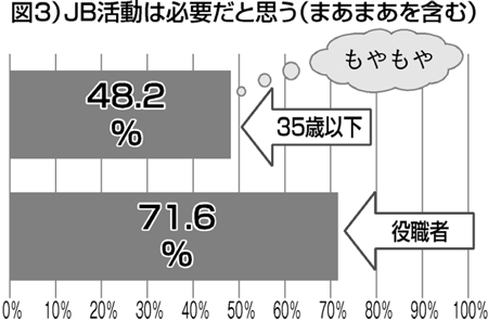 JBが「必要だと思う(まあまあを含む)」は35歳以下が48・2%、役職者71・6%で、大きな差がありました(図3)。