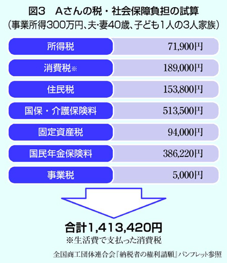 全国商工団体連合会のパンフレットによれば、新潟のAさんは内装工事業をしており、40歳で同い年の妻と5歳の子どもの3人家族。年収は300万円。そのうち51万3500円が国保・介護保険料です(図3)。その他の国保税・住民税などと合わせると、141万3420円が税と社会保障費で支払っています。これは収入の40%を超える負担になります。