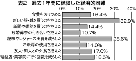 経済的困難の経験を聞いた質問では、「ない」が43・3%で、これも予想を上回りました。「我慢が当たり前」で、経済的な困難を自覚していない可能性もあります。複数回答では、「新しい衣類等の購入控え」32・9%、「レジャー費の節約」28・6%などの回答もありました(表2)。