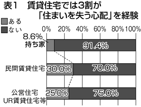 「住む場所がなくなることを心配した経験」が「ある」人は11%。持ち家の人で8・6%なのに対し、民間賃貸住宅に住む人では30%でした(表1)。