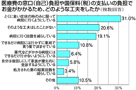 一方で、国保料(税)について普段感じていること(複数回答)では、「年々高くなり、負担を感じる」(52・3%)、「これ以上の負担はできない」(29・2%)、「日々の暮らしを圧迫している」(17・8%)と続きました。医療費の窓口負担や国保料(税)の支払いでお金がかかるためにしている工夫としてもっとも多かった回答は、「特に重い症状の時に限って病院に行くようにしている」で、3割を超えました(グラフ)。