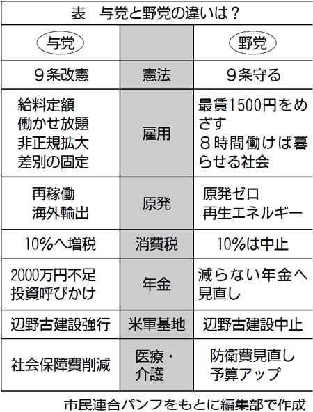 5月29日には、憲法や暮らし、経済などの13の政策について、市民連合と5野党・会派が合意。安倍・自公政権がすすめてきた政策の転換をめざしています(表)。増え続ける防衛予算を見直し、国民の暮らしにかかわる予算に振り向けることも盛り込まれました。全国の1人区で、民医連の各県連と野党候補が政策合意を結ぶなど応援が広がっています。