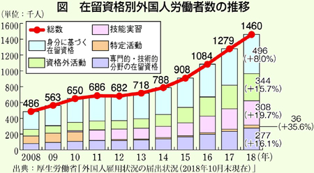教員、通訳、技術など専門労働者と実習生、特定技能の単純労働者がいます。厚労省は留学生も労働者数にカウント。この数年で倍増し、さまざまな在留資格で増えています(図)。