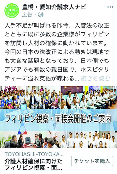 今年4月から特定技能「介護」が始まりました。人手不足に対応する制度です。これから5年間に6万人の受け入れ(19年度は5000人)を見込んでいます。技能実習3年間を終えた実習生は、特定技能でさらに5年間働けます。しかし、介護の実習生はまだ少なく、海外にも会場を設け特定技能試験を始めました。7月まではフィリピンで行われ、次にカンボジアで行う予定です。ネットにはすでにこんな広告も出ています(図)。(続く)
