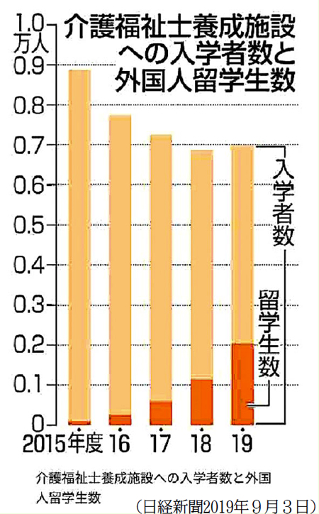 今年の介護福祉士養成施設への留学生は、昨年の2倍で2000人を超えました。日本人入学者はさらに減り、3割近くが外国人になっています(表)。新たに始まった特定技能介護は、フィリピンに続いてカンボジアでも日本に来るための試験が始まりました。否応なく外国人介護労働者が増えてきます。