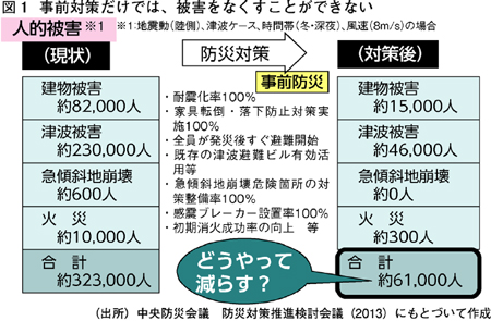 南海トラフ地震が想定される地域で耐震化、家具の固定、避難方法の想定などを100%行えば、死者は想定の32万人から6万1000人まで減らせます(図1)。しかし、それでも東北の死者の3倍です。