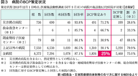 1000人以上規模の企業は6割がBCP(事業継続計画)を持っていますが、全体では15%。病院のBCP策定は25%で、拠点病院にはあっても一般のクリニックはないところも多い(図3)。