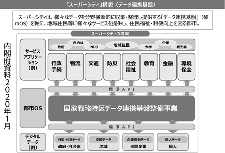 スーパーシティの肝は、「データ」です。現在、国や自治体は国民・住民の納税情報や医療・介護にかかわる個人情報、企業は消費者の購入履歴やネット上の行動履歴、スマホでの移動履歴など実に多様なデータを持っています。これらは個人情報保護関連法令によって管理され、勝手に共有することはできません。