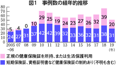 全国711の民医連事業所の患者・利用者が対象。19年度は27都道府県から51事例が寄せられました。(1)国保税(料)、その他の保険料滞納などで、無保険もしくは資格証明書、短期保険証となり、病状が悪化し死亡に至ったと考えられる事例、(2)正規保険証を保持しながら経済的事由で受診が遅れ死亡に至ったと考えられる事例です。05年度から続く調査です。