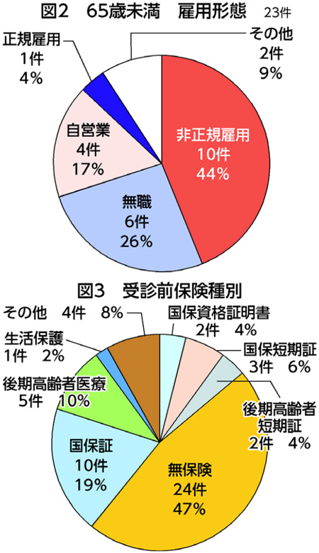 独居は27例と過半数を占め、うち借家・アパート住まいは13例。社会的孤立になりやすい傾向です。65歳未満の雇用形態では、非正規雇用が44%(10例)、無職が26%(6例)、自営業17%(4例)。保険料の滞納は17例で、住民税、家賃、水光熱費など全て滞納していた例も2例ありました。