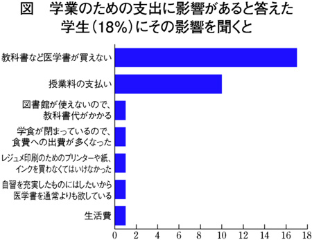 いま、医学生は大きな困難に直面しています。全日本民医連医師部でも学生の困難を把握し、その中で私たちができることは何か、学生の要求に向き合うために「新型コロナウイルスに関する医学生の実態調査」を行いました(図、別項を参照)。これをもとに学生と対話をしています。