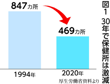 保健所は1994年の847カ所から2020年の469カ所まで削減(図1)。公務員を減らし自治体は公衆衛生と災害対策を縮小。コロナ禍で保健所はパンクし、PCR検査の数は増えませんでした。