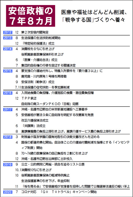ポスト安倍政権である菅政権は、新自由主義政治を見直す気配はありません。骨太方針2020では、新型コロナウイルス感染拡大を受け、公立・公的病院の再編・統合こそ明記しませんでしたが、コロナ禍の教訓を「デジタル化の遅れ」としています。全世代型社会保障第2次中間報告では、コロナ禍での特例措置はあくまで時限措置であり、予定通り、75歳以上の高齢者窓口負担の2割化などをすすめるとしています。