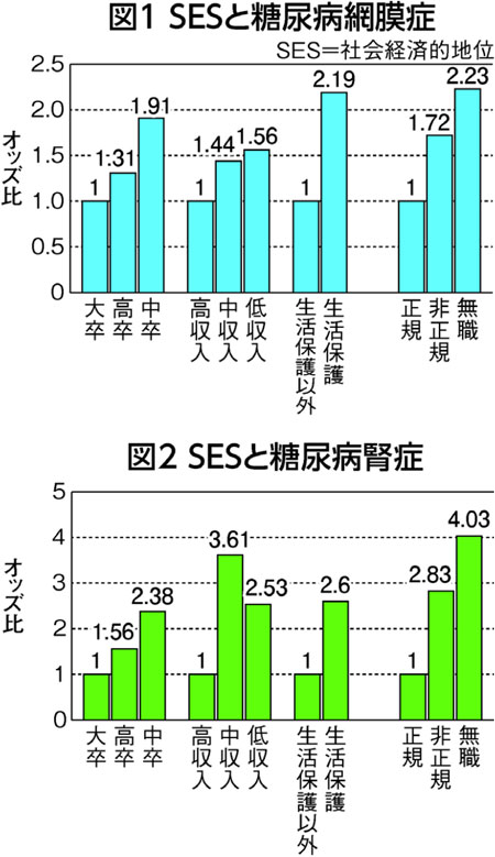 その中で、民医連がとりくんだ若年性II型糖尿病の調査について報告。この調査では社会的・経済的状況と糖尿病合併症の関連を明らかにしました(図1、2)。舟越さんはこの調査を例に、民医連のSDH研究の優位性として、「SDHの視点があること」「患者との信頼関係の強さ」「日本の臨床研究にSDHの視点がない」「民医連の患者は社会階層が低い人が多いので、少ない標本数で研究が可能」「全国ネットワークの強み」があると紹介しました。