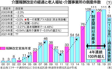 コロナ禍で介護現場が苦境に立たされています。事業所の閉鎖もあい次ぎ、倒産件数は過去最多(1~9月までで94件)。第三波とも言われる感染拡大の中で、利用者と家族、職員を守り切れるのか。介護事業所への財政支援とともに、介護職員の処遇改善と事業所の安定運営に向けた介護報酬の大幅な引き上げと、安心して介護を受けられるよう国庫負担を引き上げることこそ必要です。(丸山聡子記者)