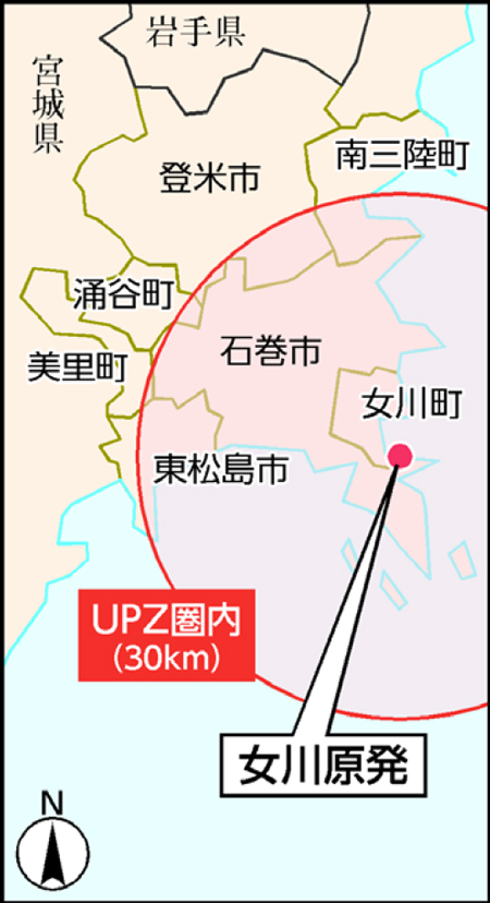 中川 県内の女川原発が再稼働の方向ですすんでいます。それに対して「NO」という運動をしています。過去には県民投票条例を制定しようと署名活動にとりくんだり、11月のピーチャリでは、事前に女川原発の避難計画に関する学習会をして、UPZ圏内(下地図)の南三陸町を走りました。