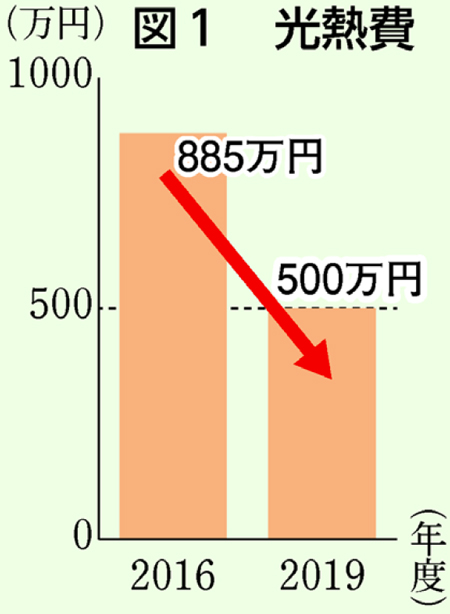 中でも、随時沸かすガスボイラーから夜間電力を利用した電気式ヒートポンプ(エコキュート)に代えた給湯は、費用対効果の高い更新でした(表)。1日に使えるお湯の量が限られるので、入浴業務での湯切れが心配でしたが、節水シャワーヘッドに代え、無理なく削減できています。
