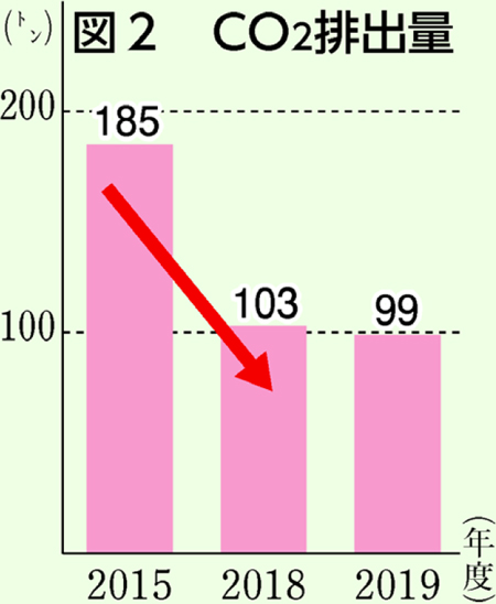 その後、光陽生協病院でも経済産業省の補助事業を使い、導入費用の2分の1の補助を受け省エネ設備を導入し、県連内全11事業所で電力購入先を変更。工事は原発の仕事をしていない業者に発注しています。クリニックでは設備更新後、光熱費とCO2排出量が約半分になりました(図1、2)。