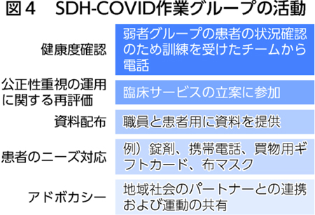 聖ミカエル病院では、20年3月にSDH COVID―19作業グループを結成。健康の公正性の視点を診療や研究に反映すること、広く地域社会と連携すること、連絡調整などを目標としました。パンデミックのもと、資源の大半が感染予防と制御に充当される、意思決定過程が旧型の構造に逆戻り、医療従事者の疲弊とストレス、などが課題です。7月末までに2300件の電話相談を行い、失業や住まいの喪失、メンタルヘルス、高齢者への支援などを行い、COVID―19社会的支援ガイドを作成しました(図4)。