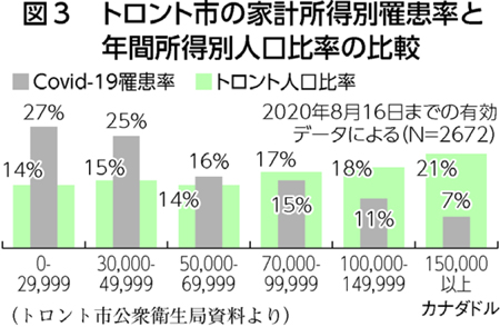 COVID―19の感染拡大は、健康格差と社会的な不公正を浮き彫りにしました。トロントで家計所得別に罹患(りかん)率を比べてみると、最高所得層の罹患率7%に対し、最低所得層は27%と4倍近く(図3)。10万人あたりのCOVID―19による入院は、最高所得は18人で、最低所得は45人にのぼりました。ホームレス状態の人の中での発生率は7・1%で、ホームレス状態でない人(0・6%)の10倍以上でした。