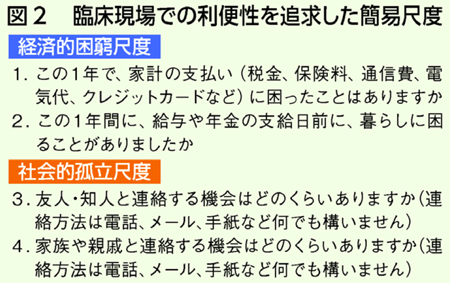 西岡さんは、患者の困窮を把握するために経済的困窮、社会的孤立の評価尺度を開発。臨床現場で活用できるように開発した簡易尺度を紹介しました(図2)。