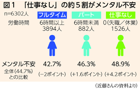 日本では、テレワークの導入や仕事量の増加の一方、非正規労働者の解雇や収入減などにより健康格差が生じています。失業者の5割がメンタル不安を抱えている結果もわかりました(図1)。