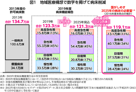 地域医療構想は、2次医療圏を基本とした構想区域ごとに、2025年度にめざすべき医療提供体制を国の主導で定めたものです。16年度までにすべての都道府県で策定されました。地域医療構想が求めているのは、(1)病床数全体の削減、(2)「慢性期」病床の削減(介護施設、在宅へ)、(3)「急性期」から「回復期」病床への移行促進、です。構想区域内の病床を高度急性期・急性期・回復期・慢性期に機能分化し、4機能ごとに医療需要と病床の必要量を推計。各医療機関の状況を「病床機能報告」で可視化し(図1)、構想区域の「地域医療構想調整会議」がPDCA(plan-do-check-act)サイクルでくり返し協議。知事権限で達成に向け医療機関に圧力をかけ、2025年度の病床数(見込み)も提出させて、病床を削減させる仕組みです。