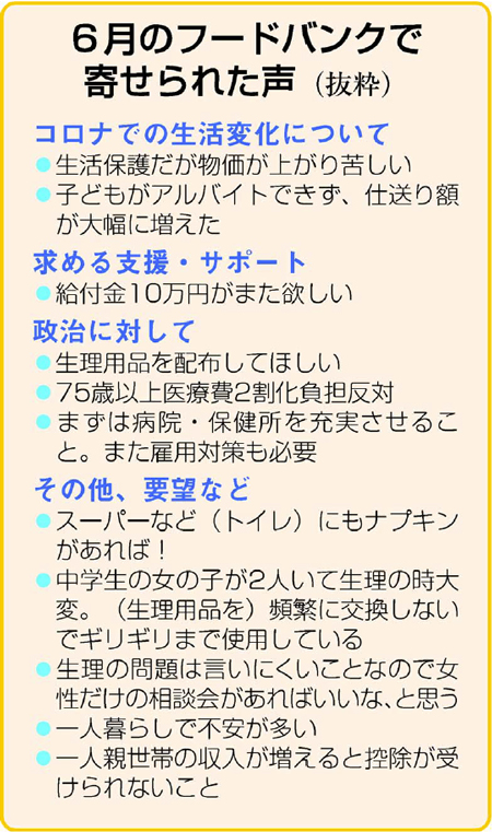 6月のフードバンクで来場者から回収したアンケートでは、「子どもがアルバイトできず、仕送り額が大幅に増えた」「中学生の女の子が2人いて(生理用品を)ギリギリまで使用している」などの声が寄せられました。