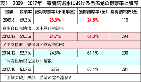 「屈辱的だが大切なこと」として、2009年からの衆議院選挙の投票結果(表1)を示し、自民党一強政治体制がつくられてきた過程を解説。小選挙区制度のもとでの投票率低下を背景に、2012年は絶対得票率(※)では約25%でしかないのに、議席獲得数は61%という異常な状況となり、その後も悪化していることが明示されました。「大量の死票が生まれ、民意が反映されない小選挙区制度で投票率が下がった。与党は国民のために政治をしなくても、対立候補になる野党共闘を分断し、国民に政治をあきらめさせれば勝てると理解している」と説明。「それに反撃するには“野党共闘”をすすめるしかない」と訴えました。