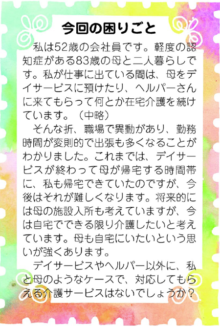 家族からのSOS(別項)に、「城北」の所長・小田衣織さん(介護福祉士)と木澤由起子さん(ケアマネジャー)が答えます。