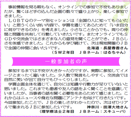 困難な状況でもJBの灯をともし続け、あらたな1ページを開いた全国JBになりました。これからJBにかかわるみなさんには、「オンラインでこれだけできた、どんな形でもできる」と伝えたい。そしてこれからも歴史あるJBを続けていってほしいです。