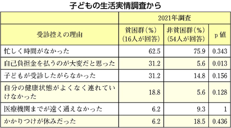 貧困世帯への影響を検討したところ、「受診控え」は18・4%(19年調査)から26・7%(21年調査)と増加し、非貧困世帯に比べて有意に高い傾向が見られます。受診控えの理由では、貧困世帯、非貧困世帯ともに「忙しくて受診する時間がなかった」がもっとも多く、貧困世帯では「自己負担金を支払うのが難しかった」と答えている割合が非貧困世帯に比べて有意に高い傾向がみられます(表)。また、「インフルエンザワクチン接種」に関しても、46・9%(19年調査)、から51・7%(21年調査)と軽微な上昇のみで、非貧困世帯の接種状況との開きは大きくなっています。貧困世帯の経済状態がコロナ禍により悪化している状況がうかがわれます。