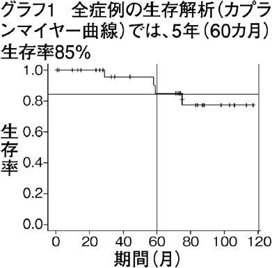 全症例での生存解析では、5年(60カ月)生存率は85%です(グラフ1)。発表当時、10年(120カ月)に到達した症例はありませんでしたが、約75%生存する可能性があることがみてとれます。