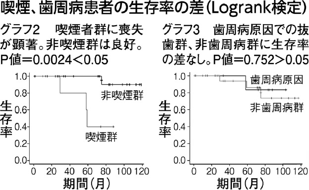 喫煙者と非喫煙者との比較では、喫煙者に喪失が顕著です(グラフ2)。抜歯の原因が歯周病の症例群と、歯周病ではない症例群も比較しましたが、生存率に明確な差はありませんでした(グラフ3)。