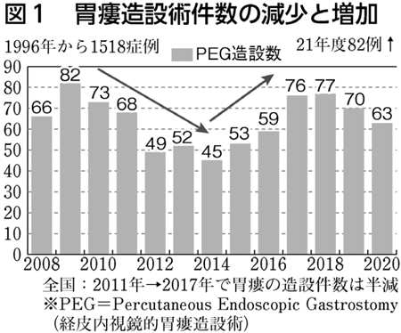 胃瘻造設は2012年以降全国的に大きく減少。当院でも胃瘻造設件数は同様に推移しています(図1)。これには大きな転換点があります。それは2012年、自民党の石原伸晃氏による胃瘻患者に対する「エイリアン」発言です。発言の誤りは、胃瘻を意識のない人に管を入れて「生かす道具」と考えたことです。その後マスコミによる、胃瘻に対するバッシングが。そのため、家族が胃瘻造設を拒否する例が増えました。