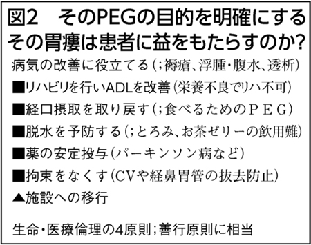 造設にあたり、その胃瘻が患者に利益をもたらすのかが重要です(図2)。また、予後の限られた人、延命目的のためだけの人にも造設は行いません。