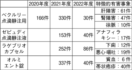 全日本副作用モニターに報告されたCOVID-19治療薬関連副作用はベクルリー点滴静注用7件(肝障害6件、嘔気(おうき)1件)、ゼビュディ点滴静注液1件(肝障害1件)、ラゲブリオカプセル4件(顔面の腫れ、下痢、発疹、不眠各1件)でした。いずれも重症度は低く、重大な経過をたどった症例はありません。