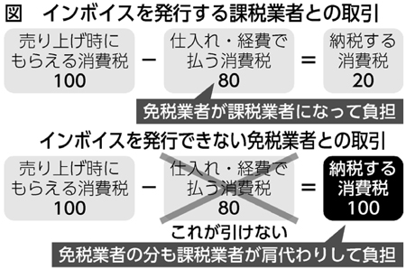 一方で、免税業者のままでいることを選択した場合、インボイスが出せません。取引相手は仕入などの消費税が引けなくなるため、自身が払う消費税の負担が増えることになります(図)。免税業者は、取引相手から(1)課税業者になるか、(2)取引をあきらめるか、(3)消費税分を値引きするか―重大な選択を迫られることになります。