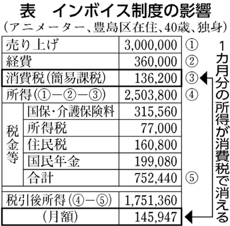 問題なのは、インボイス登録事業者は自動的に消費税の課税業者になってしまうことです。これまで年間売り上げが1000万円以下の小規模な事業者は、消費税の納税が免除されていました。しかし、登録すれば新たに納税義務が発生します。財務省の試算では、インボイス導入で新たに納税者となる事業者の平均年間課税売上は550万円で、平均納税額は15万4000円に上ります。年収300万円のアニメーターの場合で試算した結果、ほぼ1カ月分の所得を失うことになるなど、大きな負担増となります(表)。声優の有志団体の調べでは、年収300万円以下が7割超を占め、インボイスで2割強が廃業を検討との結果も出ています。