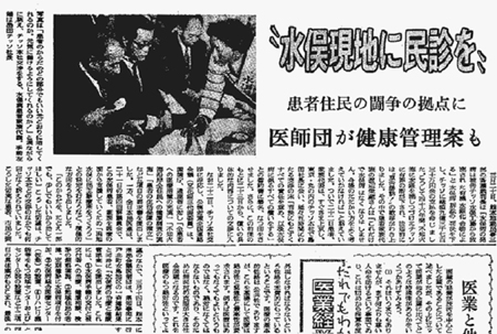 1950~60年代、急速に公害がひろがり、民医連は患者・家族をささえる活動を展開。熊本・水俣病のたたかいは水俣協立診療所(現・水俣協立病院)の設立にもつながった(1973年4月1日号)