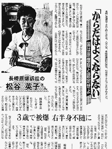 被爆者医療にもとりくんできた民医連。長崎の被爆者・松谷英子さんの原爆症認定を求める裁判は1988~2000年までたたかわれ、勝訴。民医連も専任者を配置して支援した(1990年9月1日号)